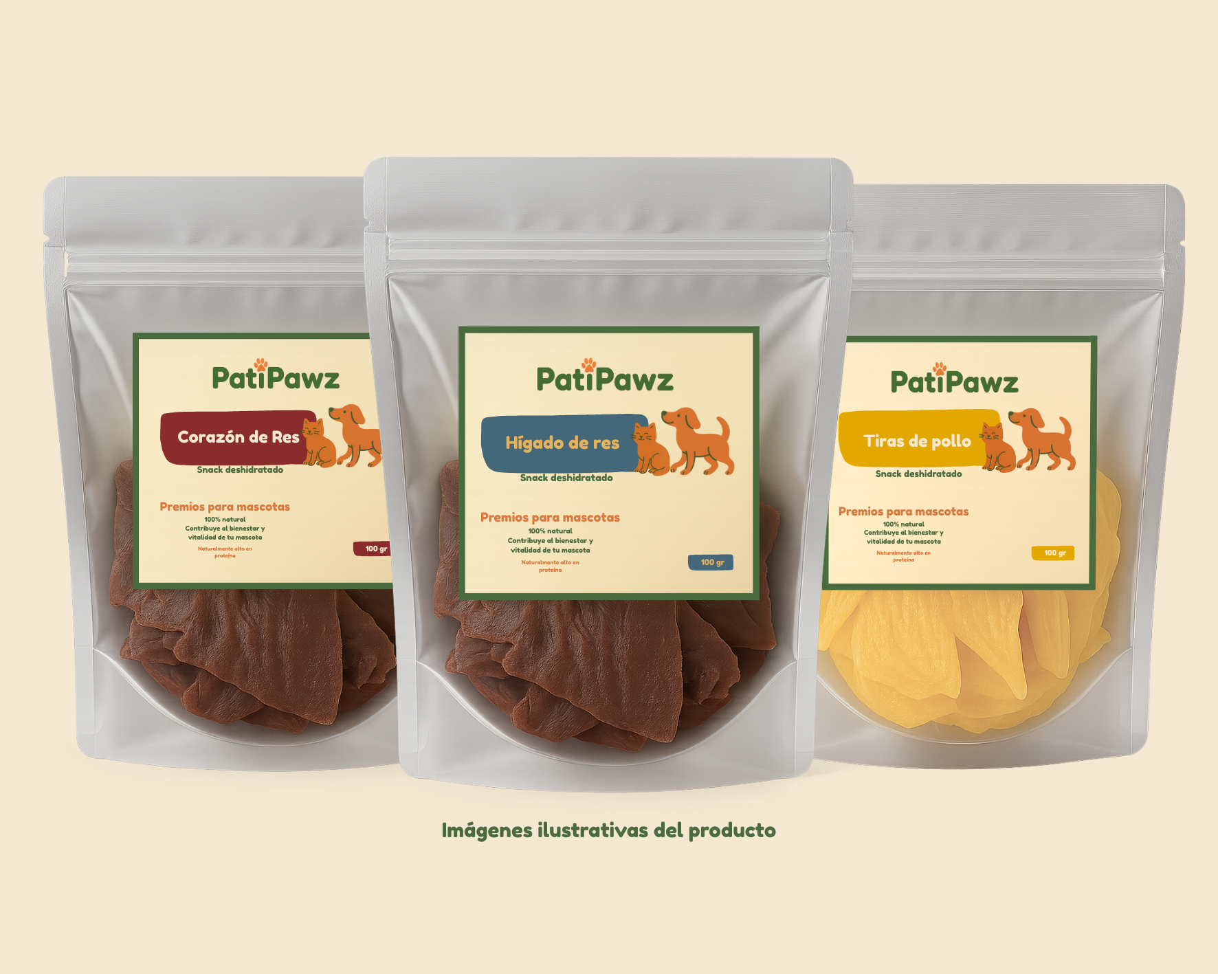 Hígado de res, corazón de res y pechuga de pollo deshidratados, sin aditivos.